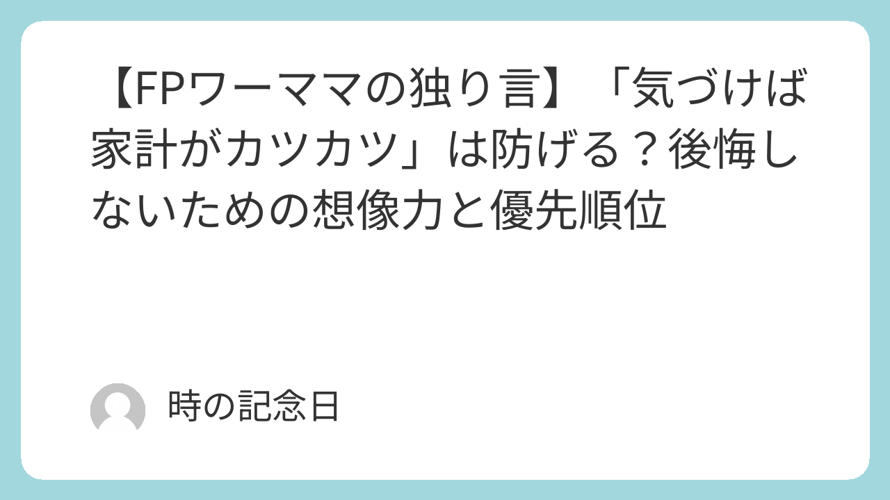 例えば、子供が生まれたときに「10年後の教育費」や「成長したときの部屋の使い方」をほんの少し想像してみる。 車を買うときに「週1回の利用なら、レンタカーやタクシーの方が安くて、その分貯金が増えるかも?」とシミュレーションしてみる。