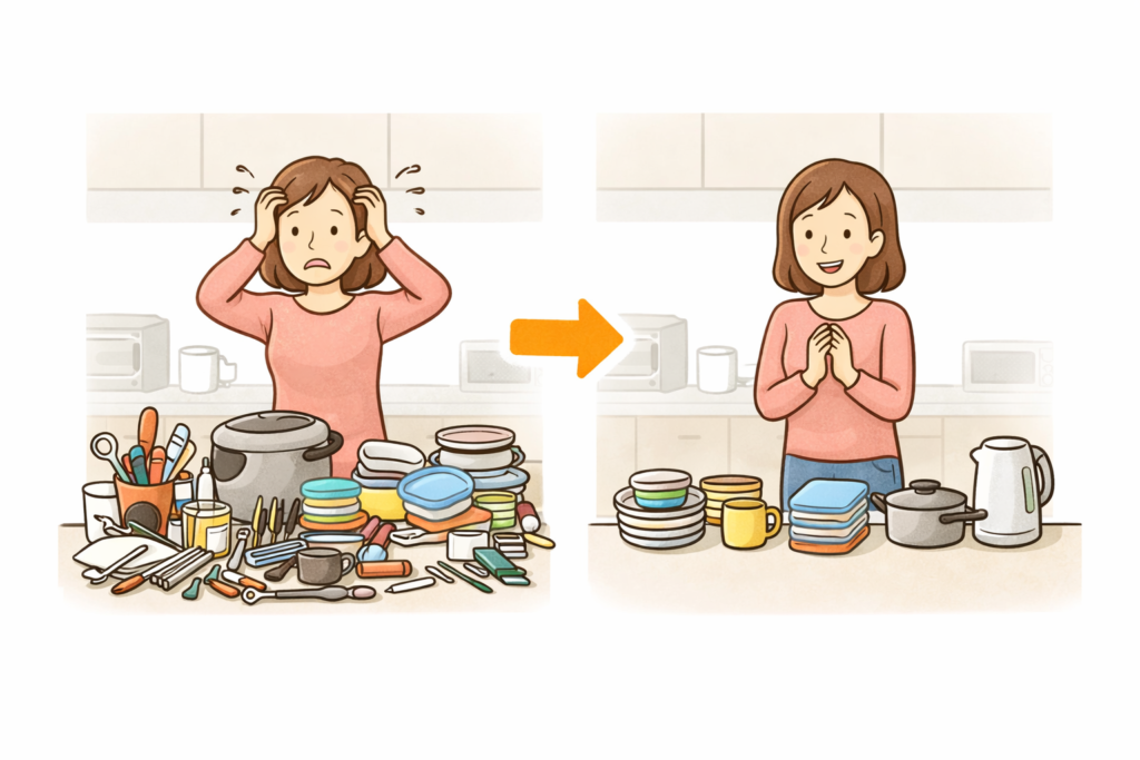 キッチンは家事の戦場ですからね。でも想像してみてください。調理道具が100個あるときと、厳選された30個だけのとき。どちらが「管理」や「掃除」が楽でしょうか?